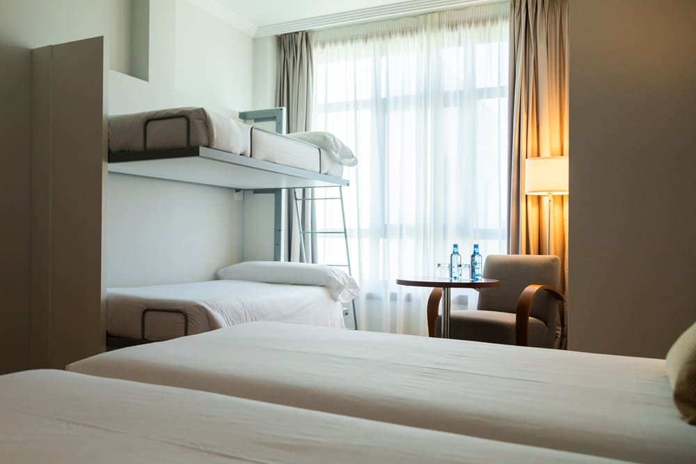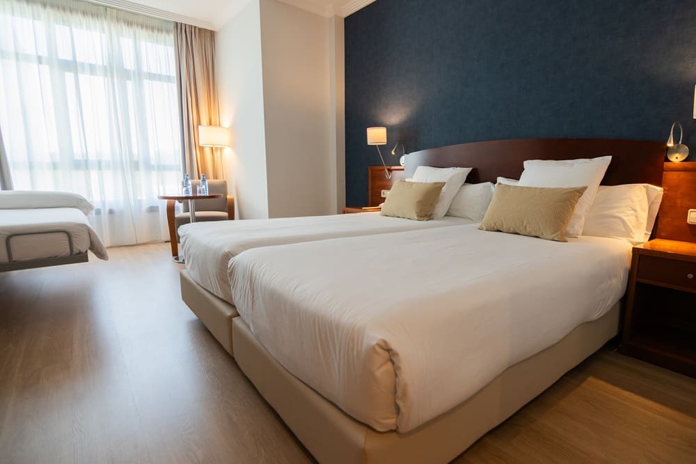 Habitaciones acondicionadas para una confortable estancia de 3 adultos ó 2 adultos y 1 niño. Disponen de un amplio ventanal con vistas a los jardines.